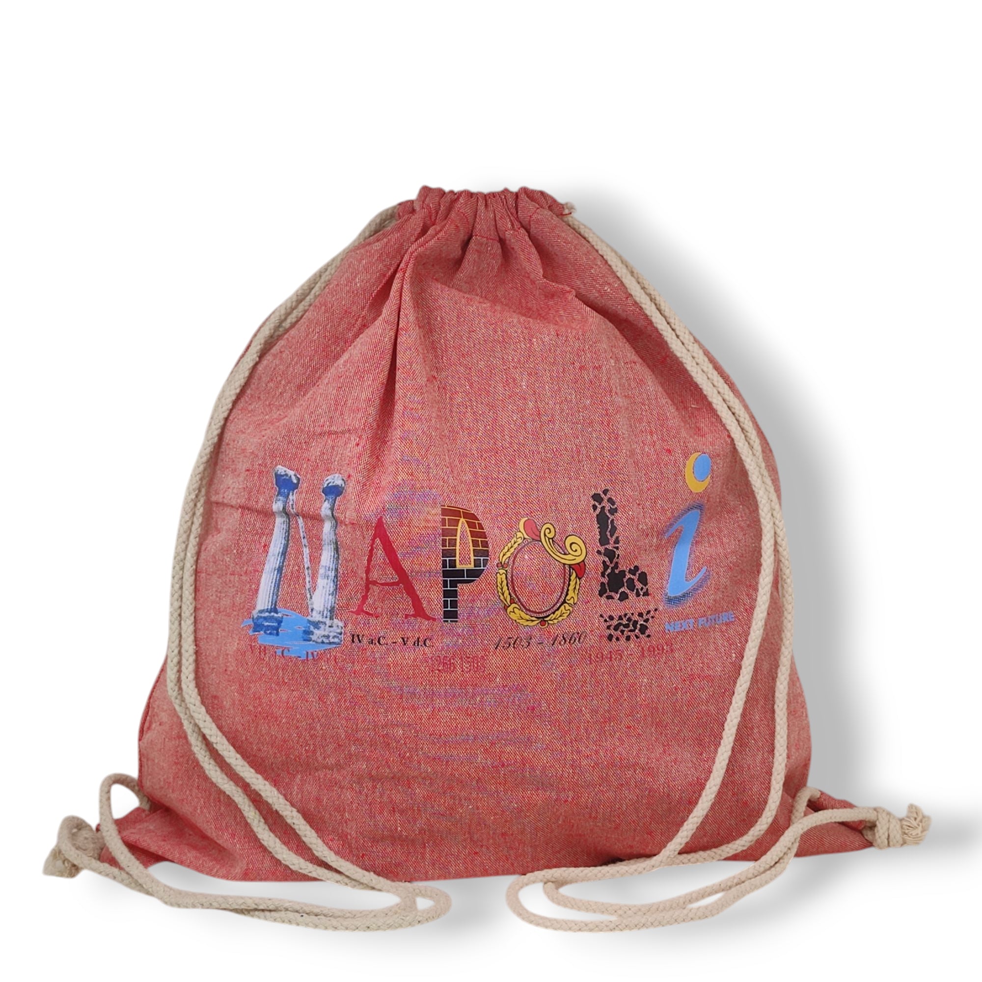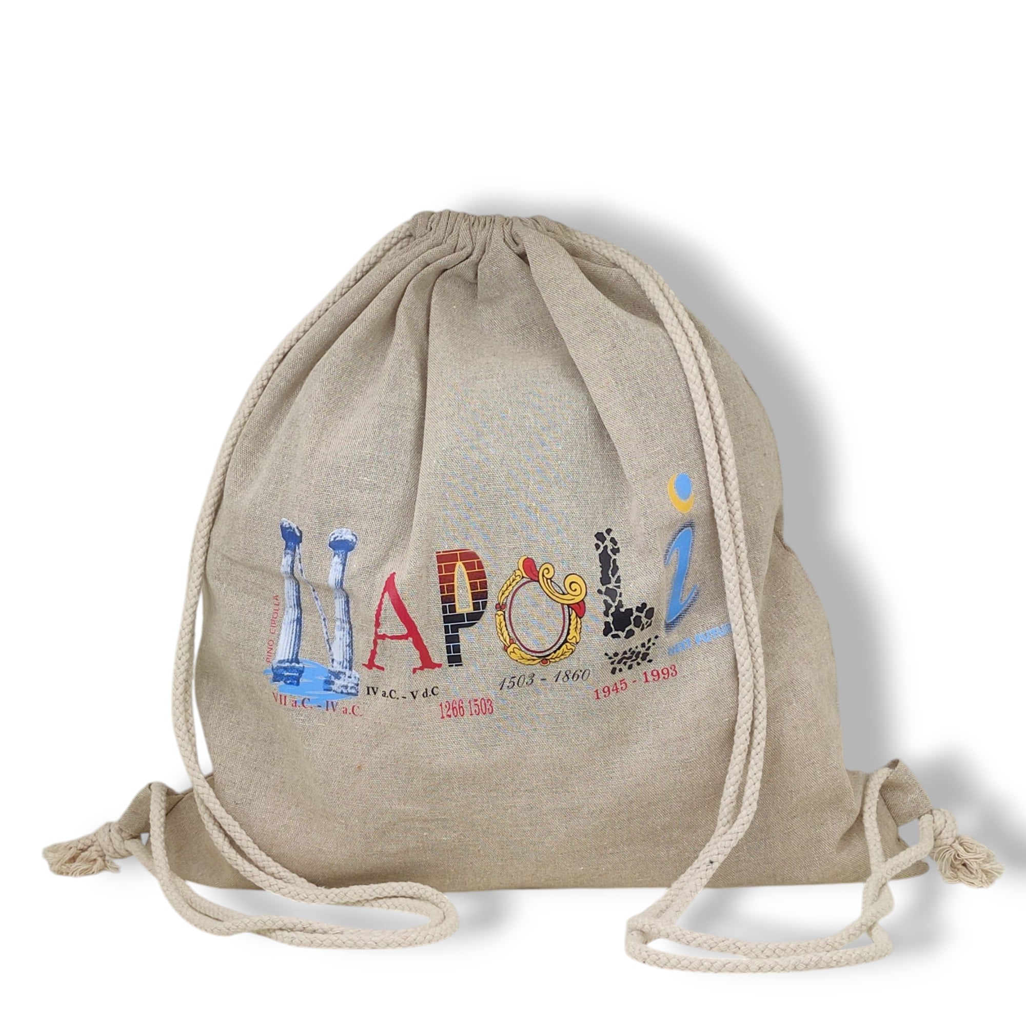 Entdecken Sie den Baumwollrucksack mit Kordeln, inspiriert von Neapel und dem unverwechselbaren künstlerischen Stil von Quirino Cipolla. Ein einzigartiges Accessoire, das vollständig in Italien hergestellt wird und Qualität, Kunst und Tradition vereint.