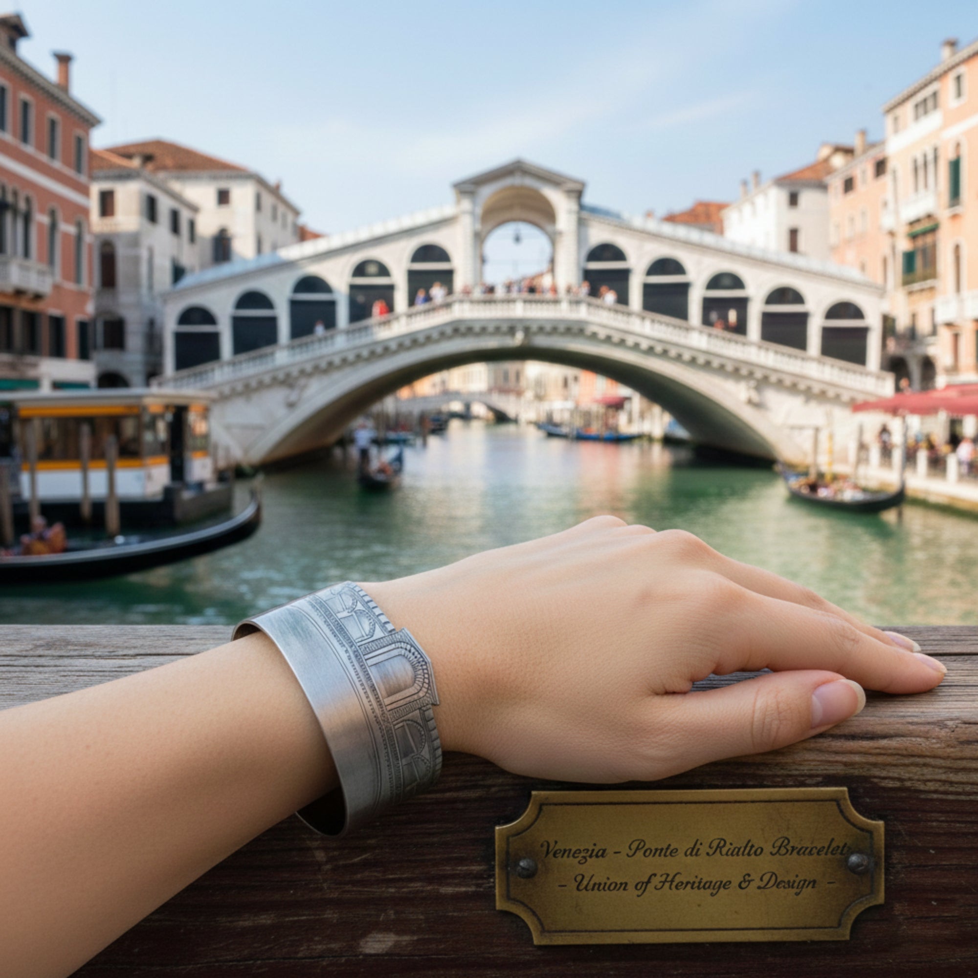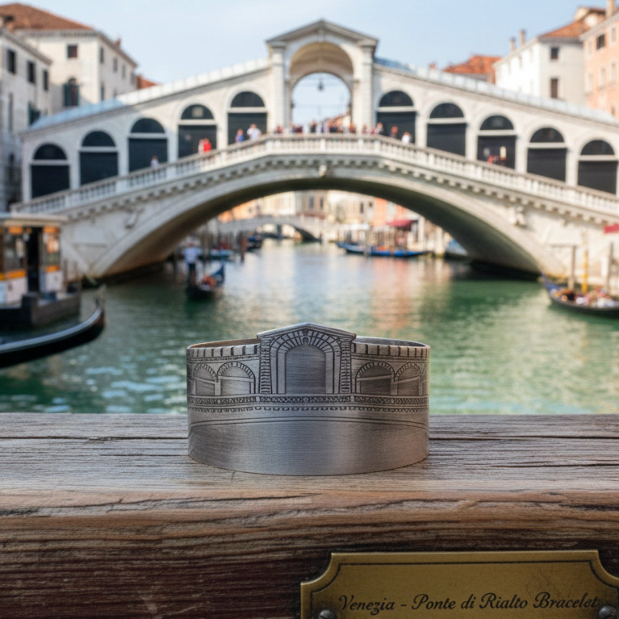 Das Rialtobrücken-Armband ist ein exklusives Messingjuwel, das von der berühmten Venedigbrücke, die den Canal Grande überquert, inspiriert ist. Dieser Armreif gibt die architektonischen Details der Brücke auf exquisite Weise wieder und fängt ihre historische Schönheit und kulturelle Bedeutung ein. Jedes Element des Armbands ist sorgfältig verarbeitet, mit besonderem Augenmerk auf die Präzision der Details, was dieses Accessoire zu einer perfekten Hommage an die Lagunenstadt macht.