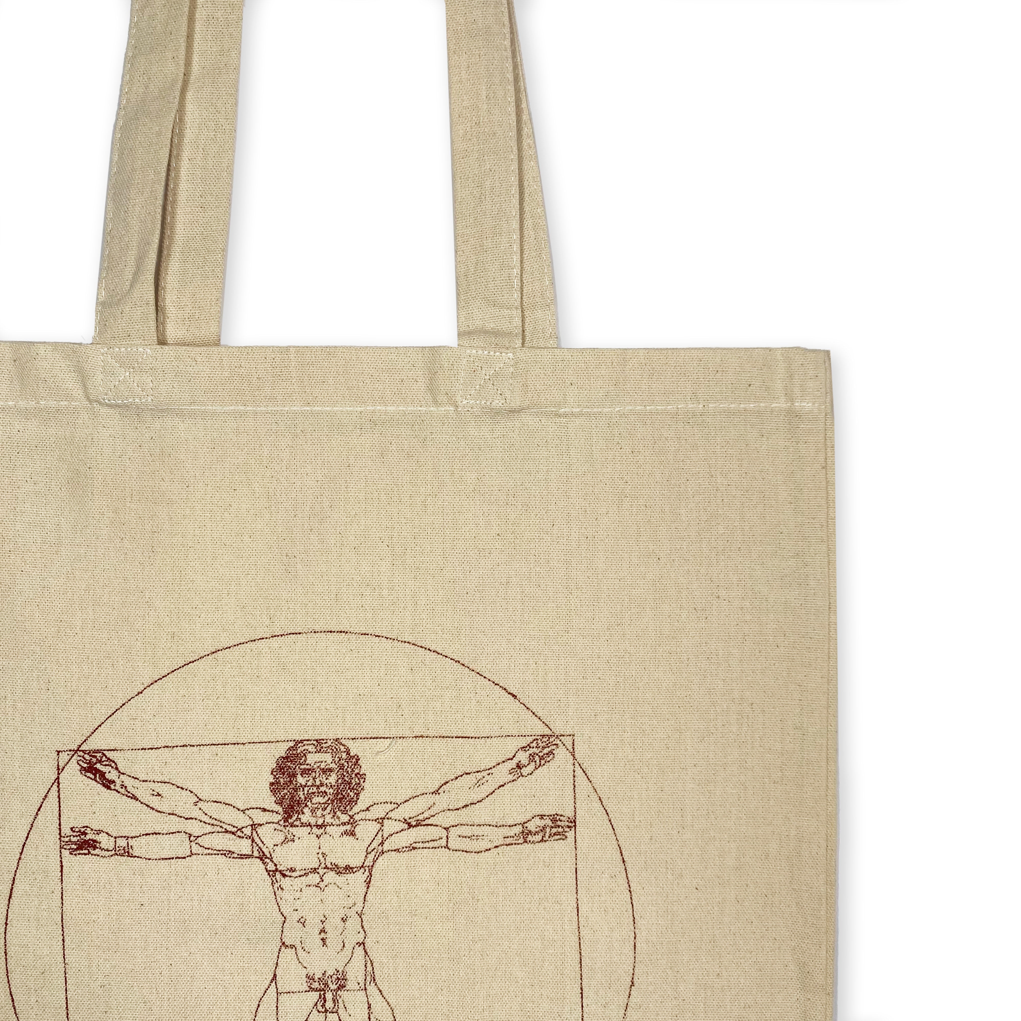 Fügen Sie Ihrem Alltag mit der Shopping bag Uomo Vitruviano, inspiriert von dem berühmten Zeichnung von Leonardo Da Vinci, einen künstlerischen und ökologischen Touch hinzu.
