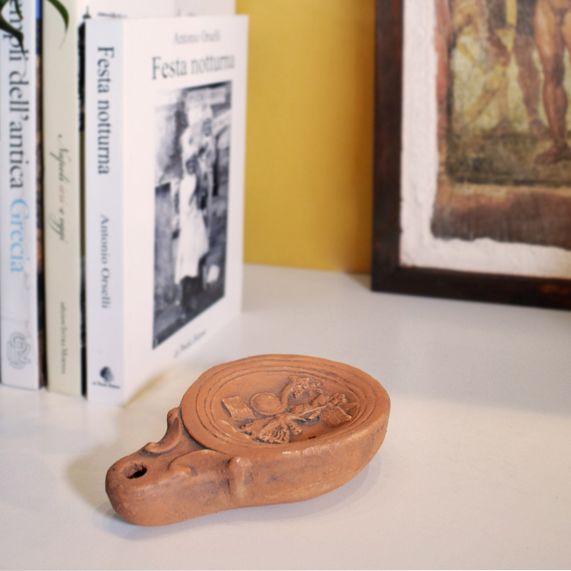 Laterne Schenken Sie Glück Reproduktion aus Terrakotta, inspiriert von der antiken Lampe aus dem 1. Jahrhundert. Chr. mit der Gottheit Fortuna, aufbewahrt im Nationalmuseum Atesino, Este. Funktionierende Öllampe.
