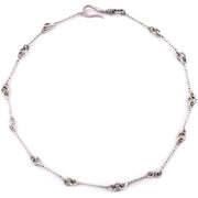 Die in Pompeji und anderen römischen Städten gefundenen Juwelen zeugen vom kultivierten Lebensstil der Zeit, in der Frauen Gold- und Silberornamente trugen, die mit Natursteinen und symbolischen Verzierungen verziert waren. Viele der in den Ruinen von Pompeji gefundenen Juwelen wurden nicht nur als Schönheitsobjekte, sondern auch als Schutzamulette verwendet. Diese Art von Halskette mit dekorativen Haken spiegelt das Können pompejanischer Kunsthandwerker wider, die wie diese Silberreproduktion Meisterwerke geschaffen haben, die Jahrhunderte überdauern werden.