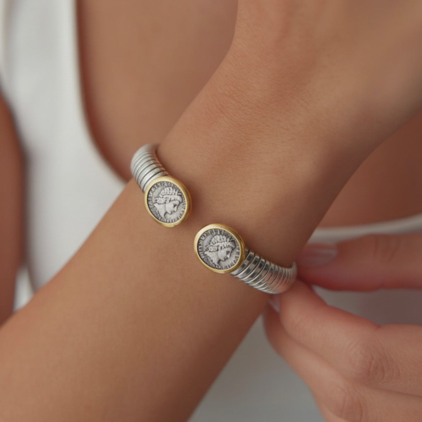 The antique coin bracelet, made of stainless steel, 925 silver and 18K gold plated, is an accessory refined that combines history and modernity. The design is embellished with a replica of an ancient coin, on which the face of a Roman emperor is hand-engraved.