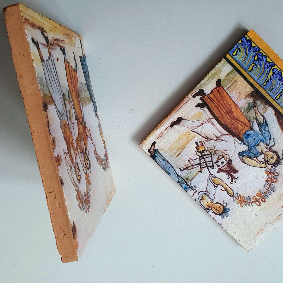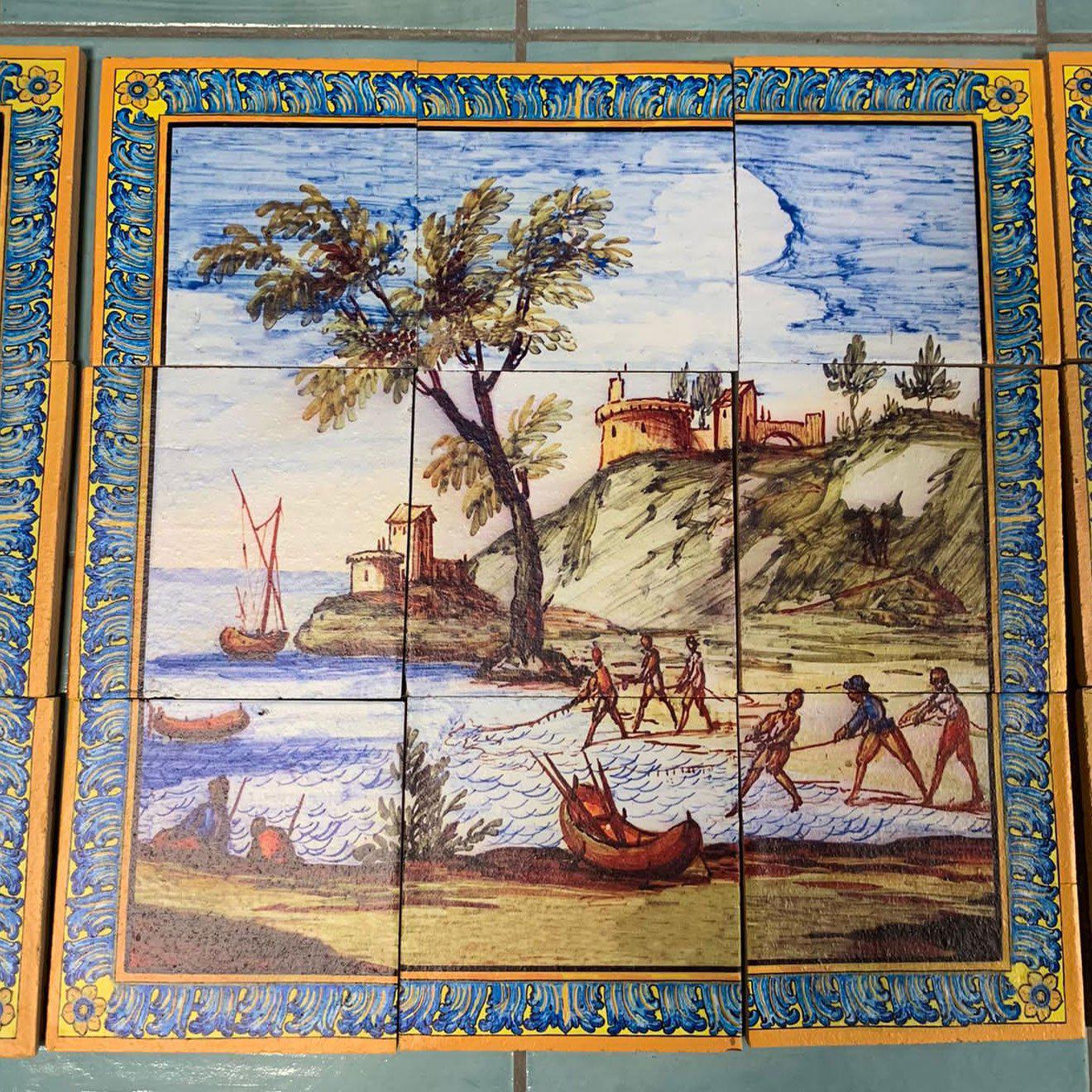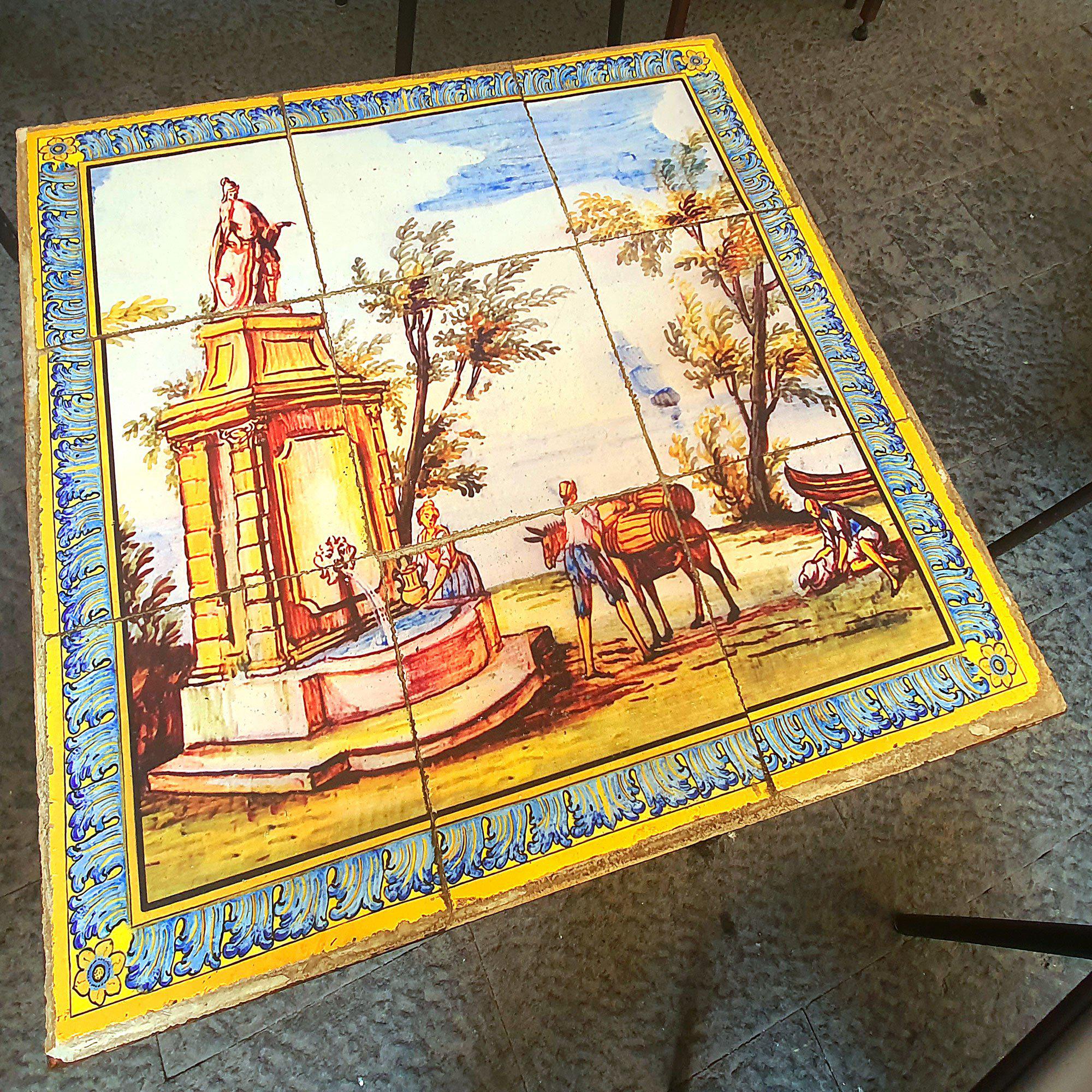 Inspired by the decorations of the famous Neapolitan cloister, some marine, rural and mountain landscapes have been reproduced on this panel, as well as scenes of life and celebration, depicted in the backrests of the benches of the Cloister of Santa Chiara.