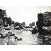 Titolo:Dos mujeres con ropas tradicionales se bañan en las aguas de Capri, cerca de una pequeña playa de la isla. Al fondo los Farallones