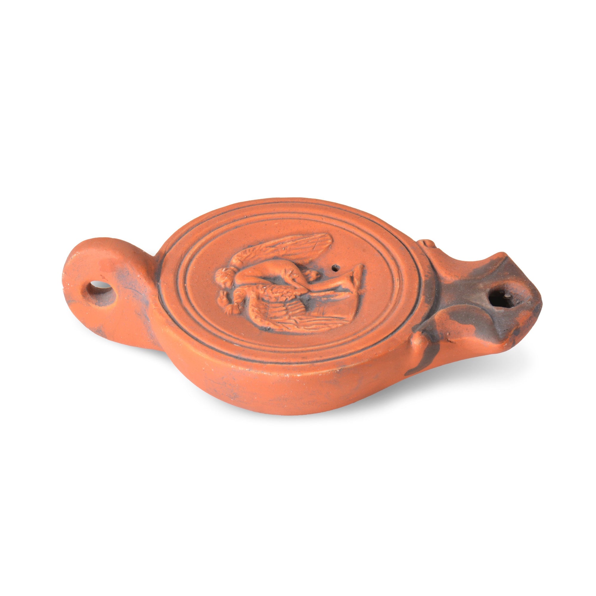Lanterne Donner de la fortune reproduction en terre cuite, inspirée de la lampe ancienne du 1er siècle. AD avec la divinité Fortuna, conservée au Musée National Atesino, Este. Lampe à huile qui fonctionne.
