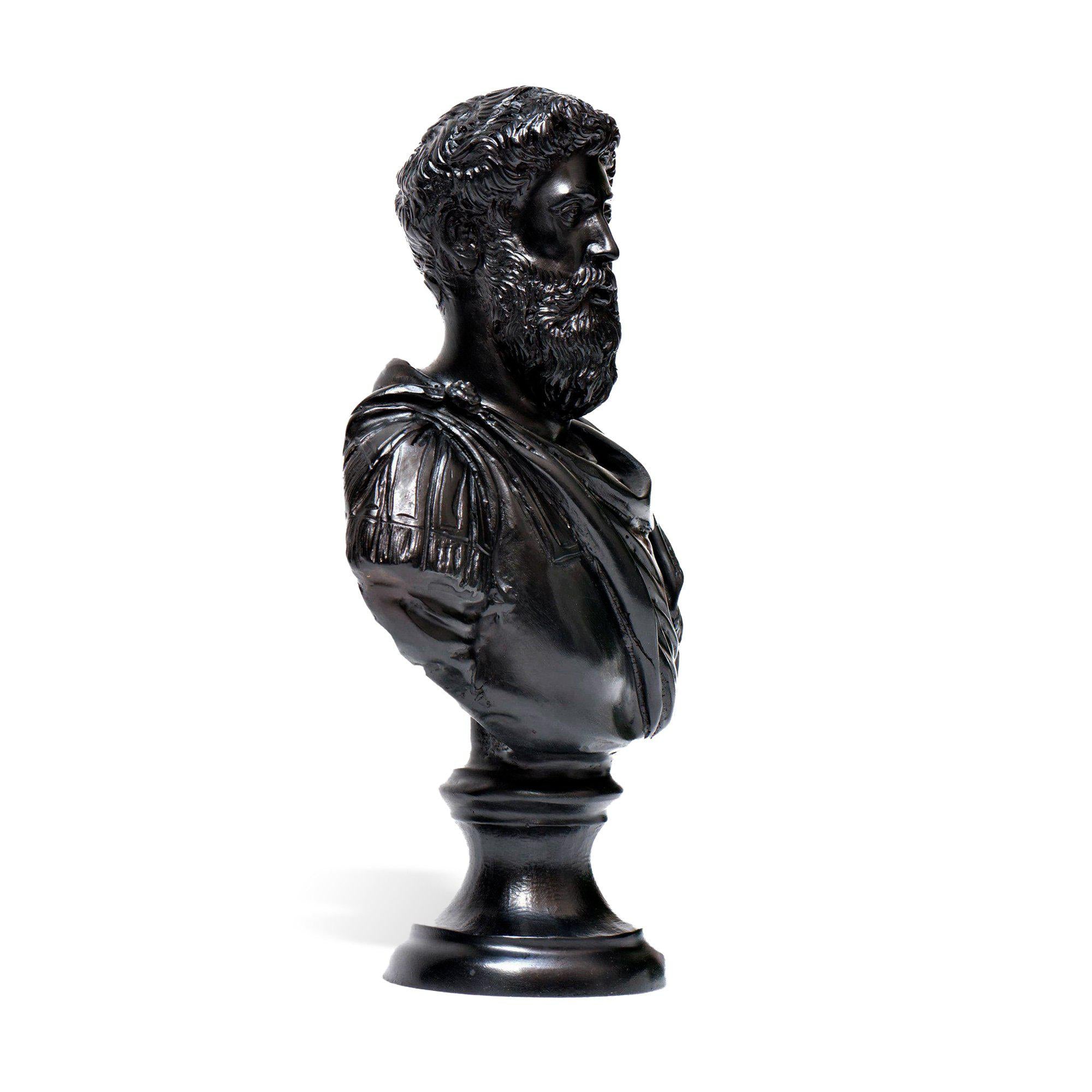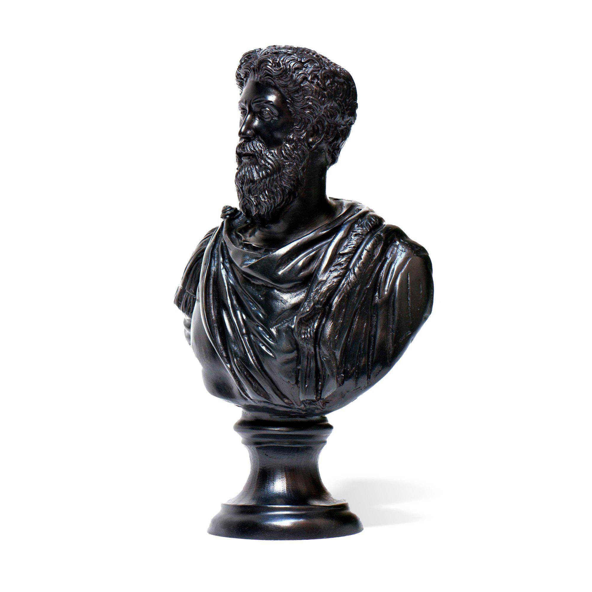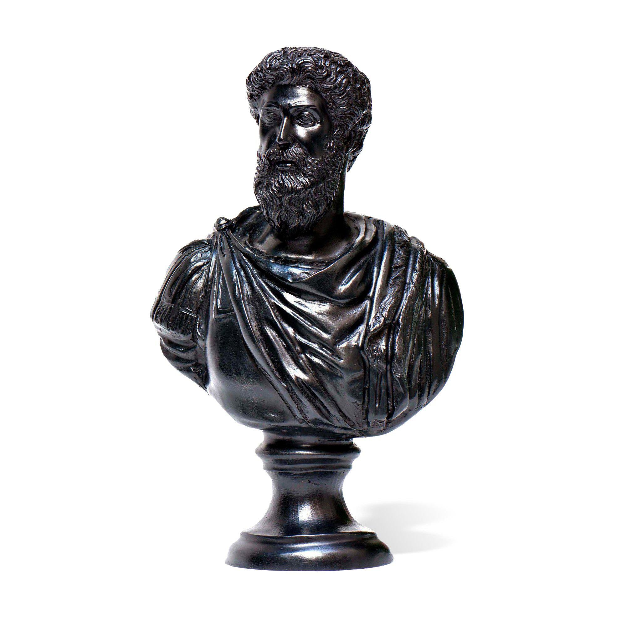 Ce buste de l'empereur MarcAurèle s'inspire de la célèbre statue équestre conservée dans les Musées Capitolins de Rome. La sculpture reproduit la grandeur et la sagesse de l'empereur.