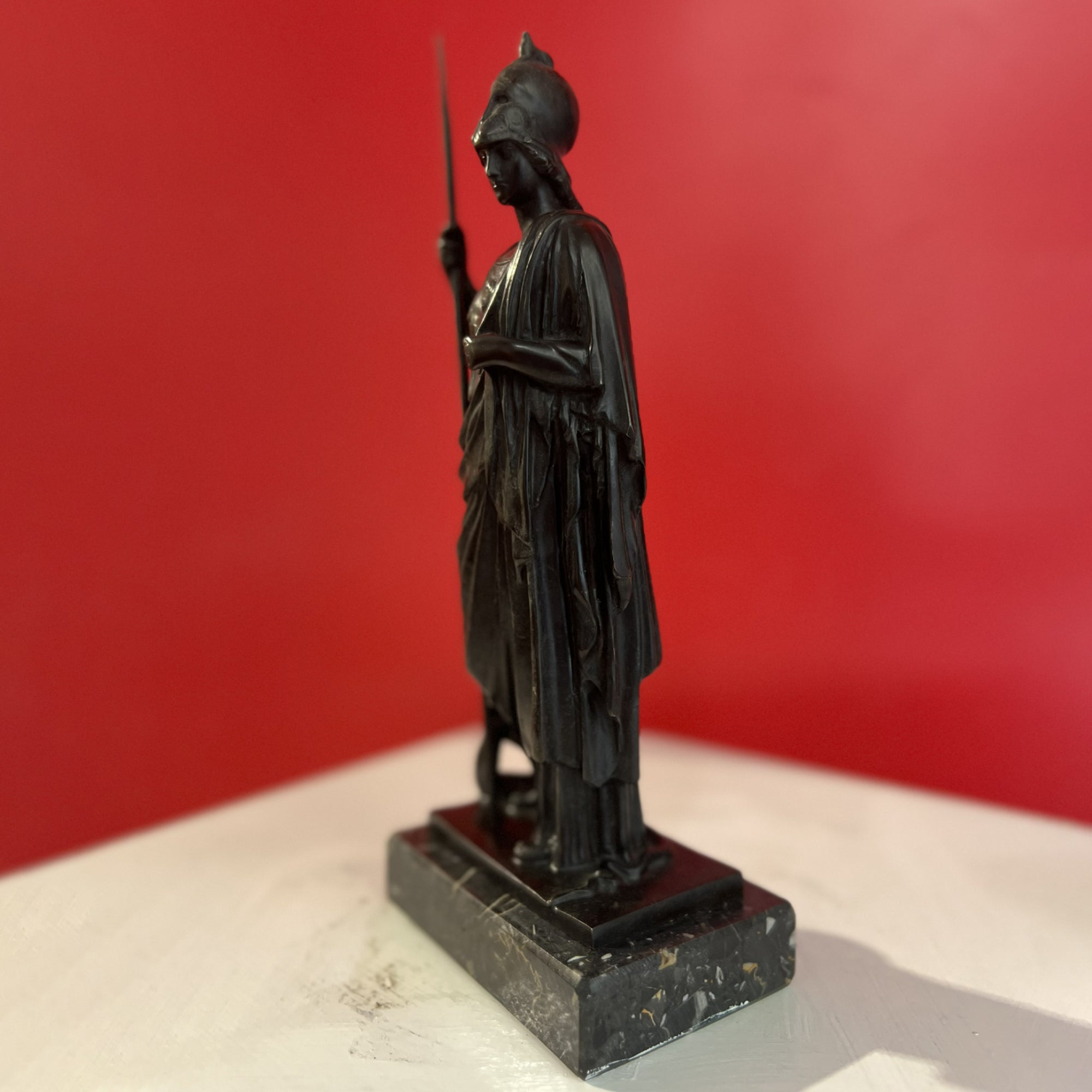 この青銅の像はミネルヴァ(ギリシャ神話ではアテナ)を描いており、彼女はジュピターとその最初の妻メティスの娘です。彼女はローマの忠誠心ある戦いの女神であり、正義の戦争、知恵の女神であり、職人の守護者でもあります。