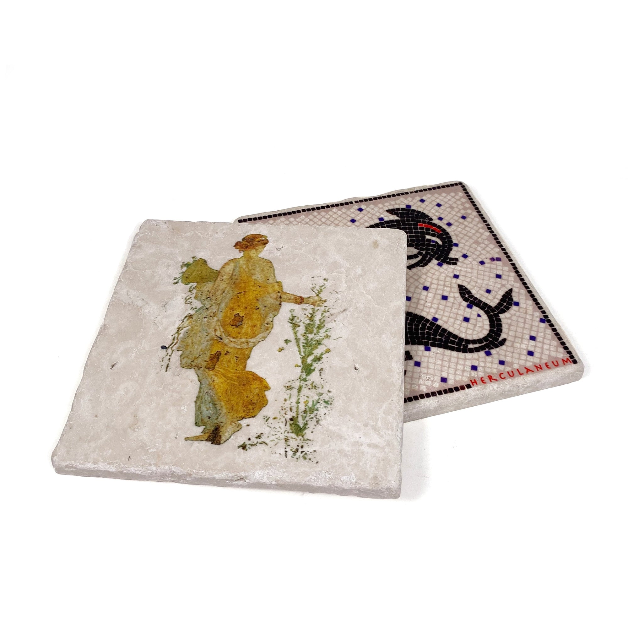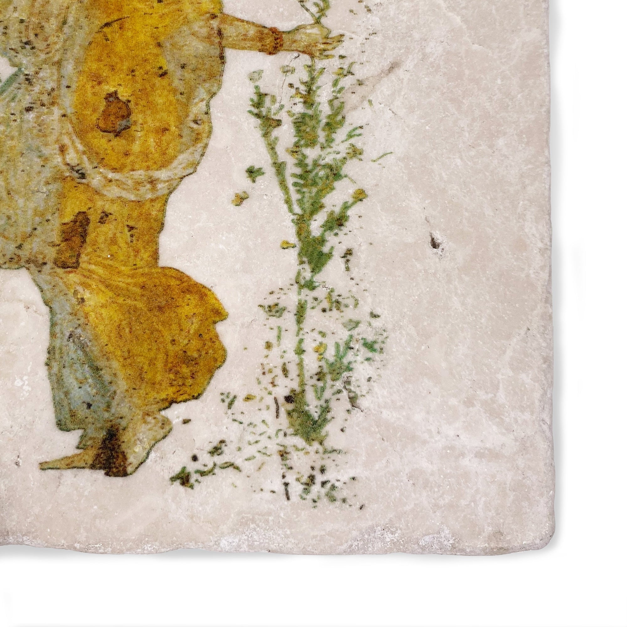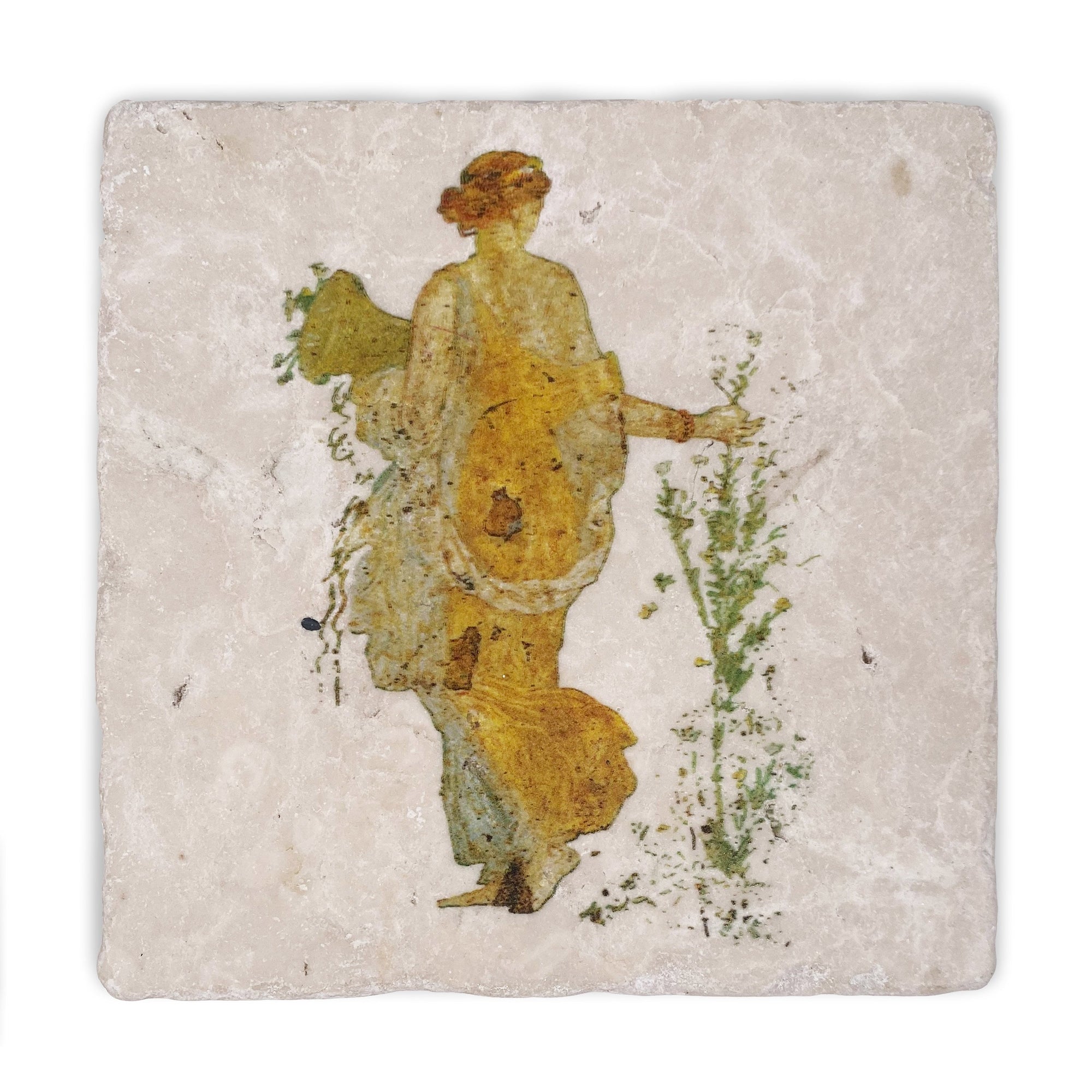La rappresentazione di Flora che decora questa mattonella è ispirata ai magnifici affreschi ritrovati a Pompei, una città che offre un'immensa testimonianza della vita quotidiana e delle credenze religiose nell'antica Roma. Gli affreschi di Flora, spesso raffigurata mentre raccoglie fiori o distribuisce ghirlande, simboleggiano l'abbondanza e la prosperità che la primavera porta con sé.