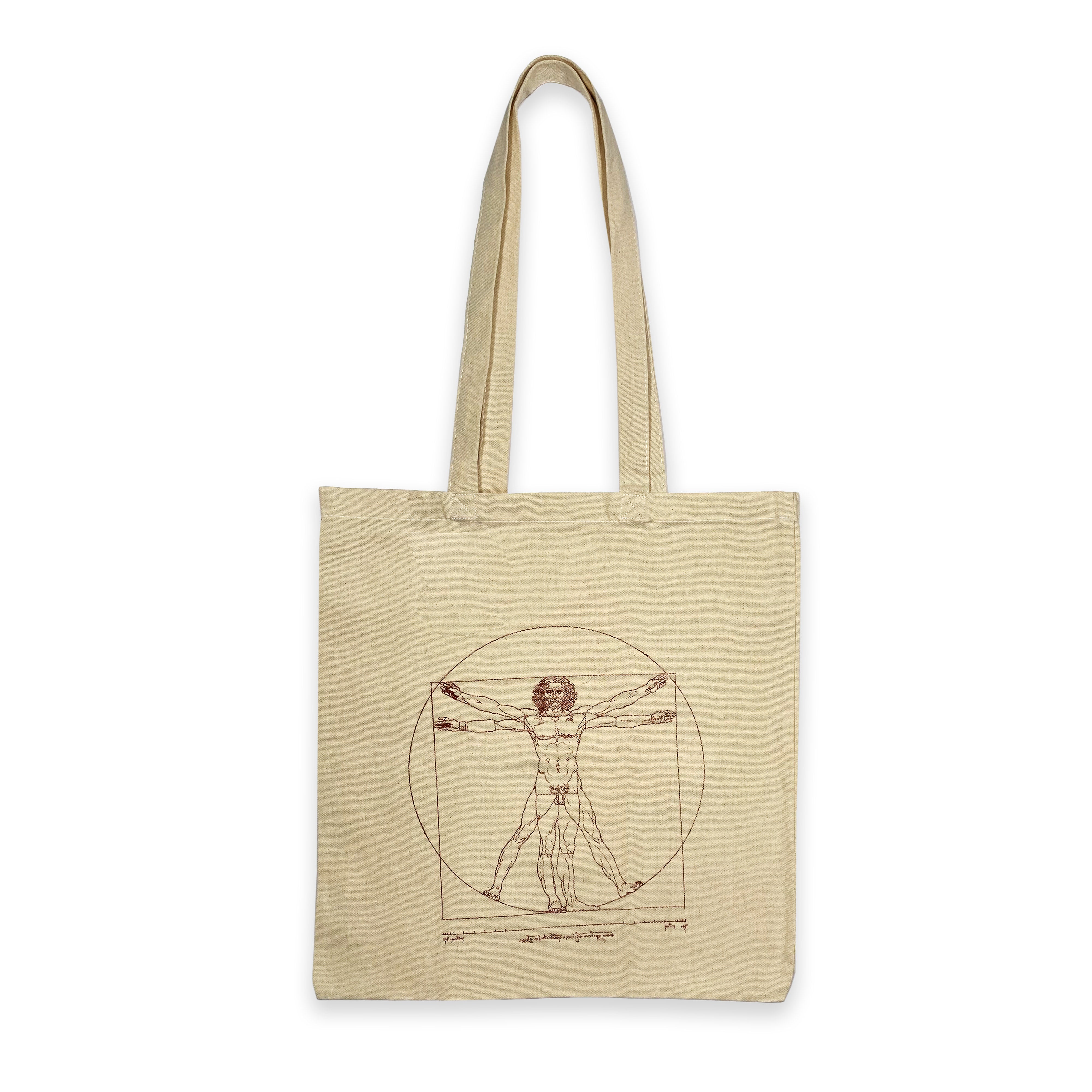 Aggiungi un tocco artistico ed ecologico alla tua quotidianità con la Shopping bag Uomo Vitruviano ispirata al celebre disegno di Leonardo Da Vinci.