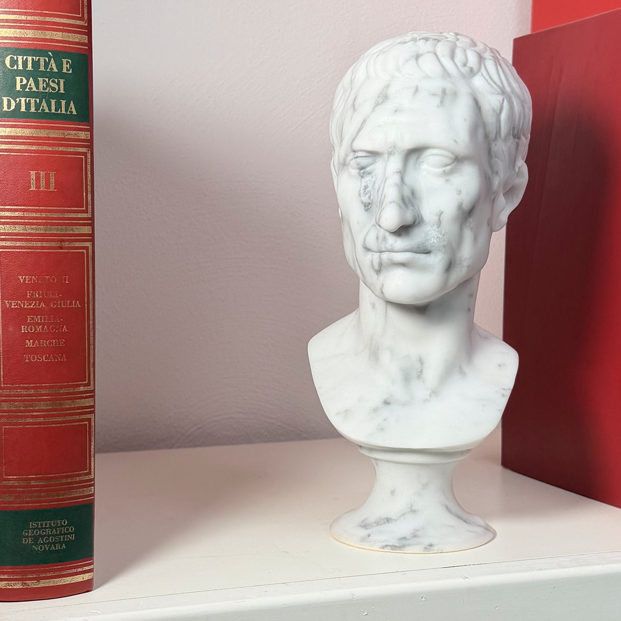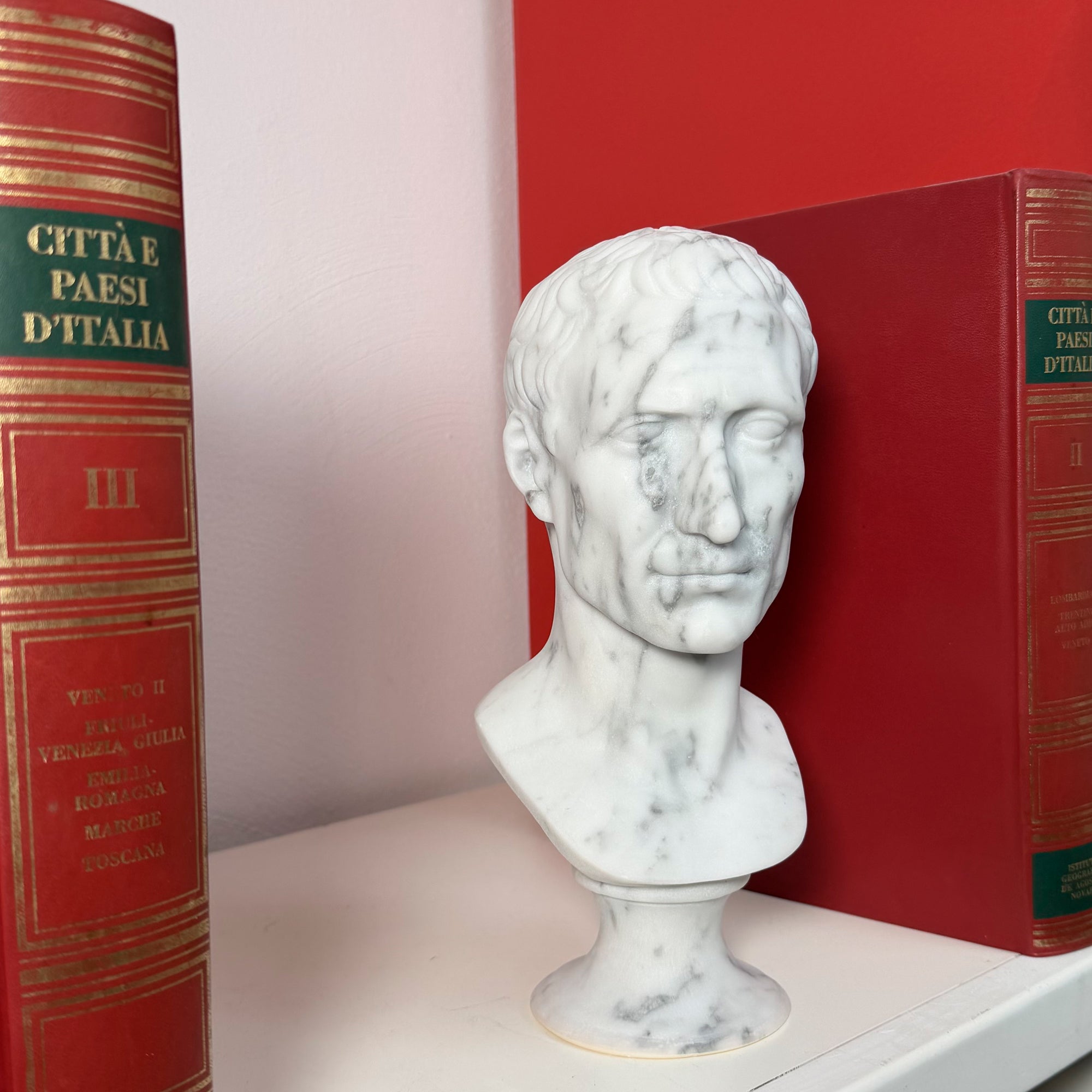 Принесите в свой дом аутентичную атмосферу древнего Рима с этой изысканной мраморной головой Гая Юлия Цезаря высотой 30 см, точной репродукцией, вдохновлённой великими шедеврами классической скульптуры.