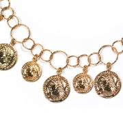 Откройте для себя изысканность и элегантность нашего ожерелья с подвесками-медалями — драгоценного камня, сочетающего в себе традиции и современность. Это колье из серебра 925 пробы с покрытием из 18-каратного золота, изготовленное вручную в Италии, состоит из серии подвесок, напоминающих древние мотивы, такие как медали, типичные для искусства и культуры Древнего Рима и Греции.