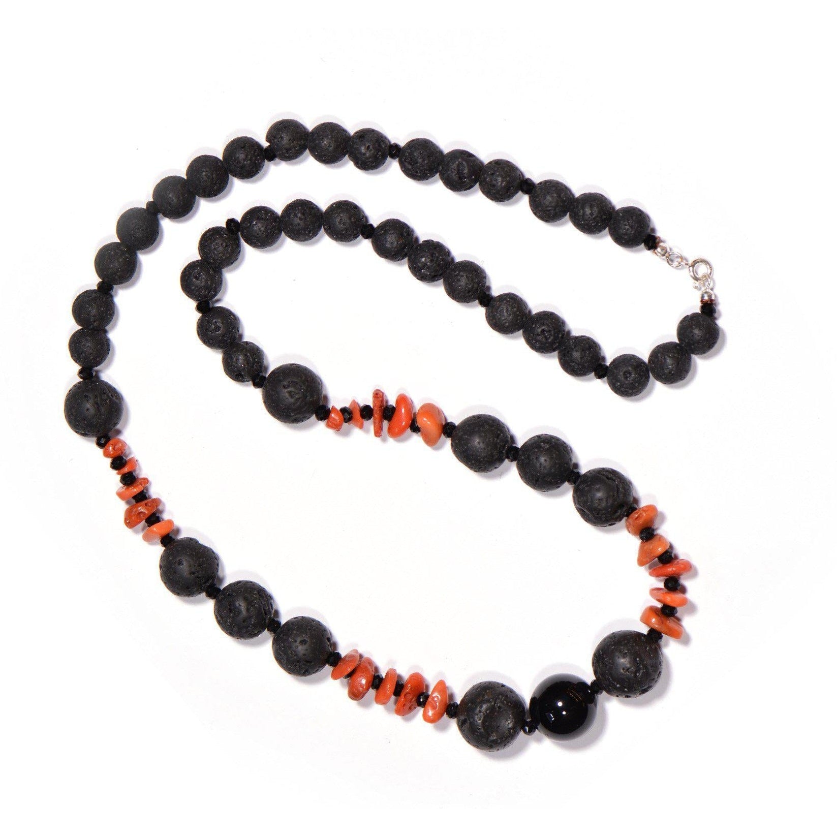 Колье с лавовым камнем, ониксом и красным кораллом — изысканное украшение, изготовленное из натуральных материалов, передающих энергию земли и моря. Лавовый камень, символ Везувия, олицетворяет силу и стойкость. оникс, известный своими защитными свойствами, вселял силу и мудрость. Красный коралл использовался в средиземноморских культурах как амулет, защищающий от негатива и привлекающий удачу.